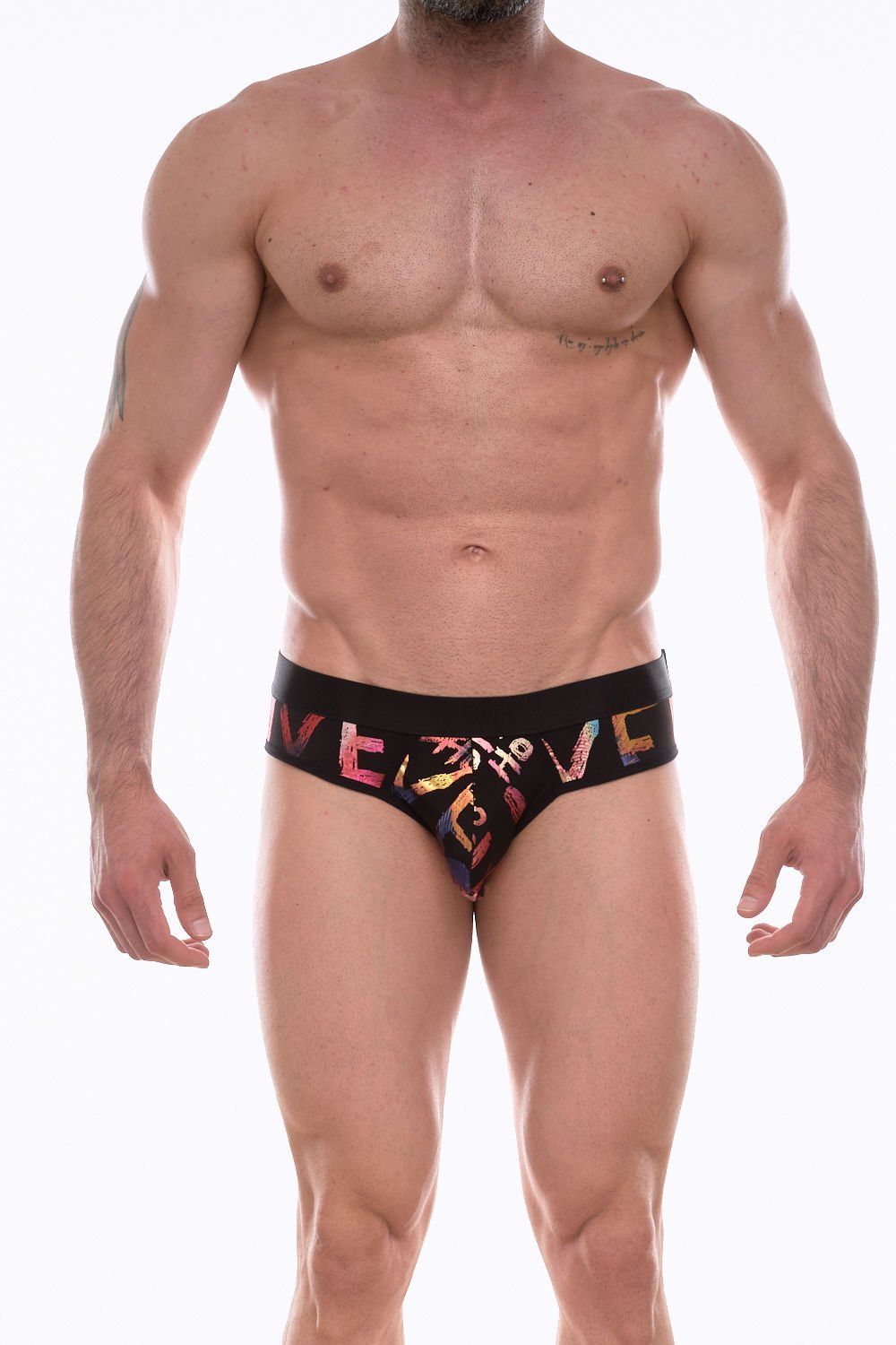 Черные трусы-брифы с блестящим принтом в виде надписей и губ.