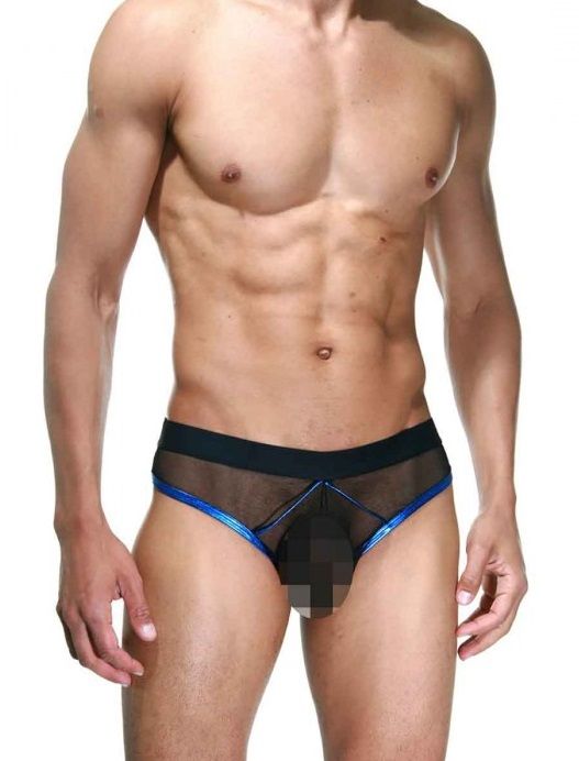 Мужские полупрозрачные трусы-слипы, с открытыми гениталиями. Окантованы яркой синей блестящей гладкой тканью, на широкой черной резинке.
