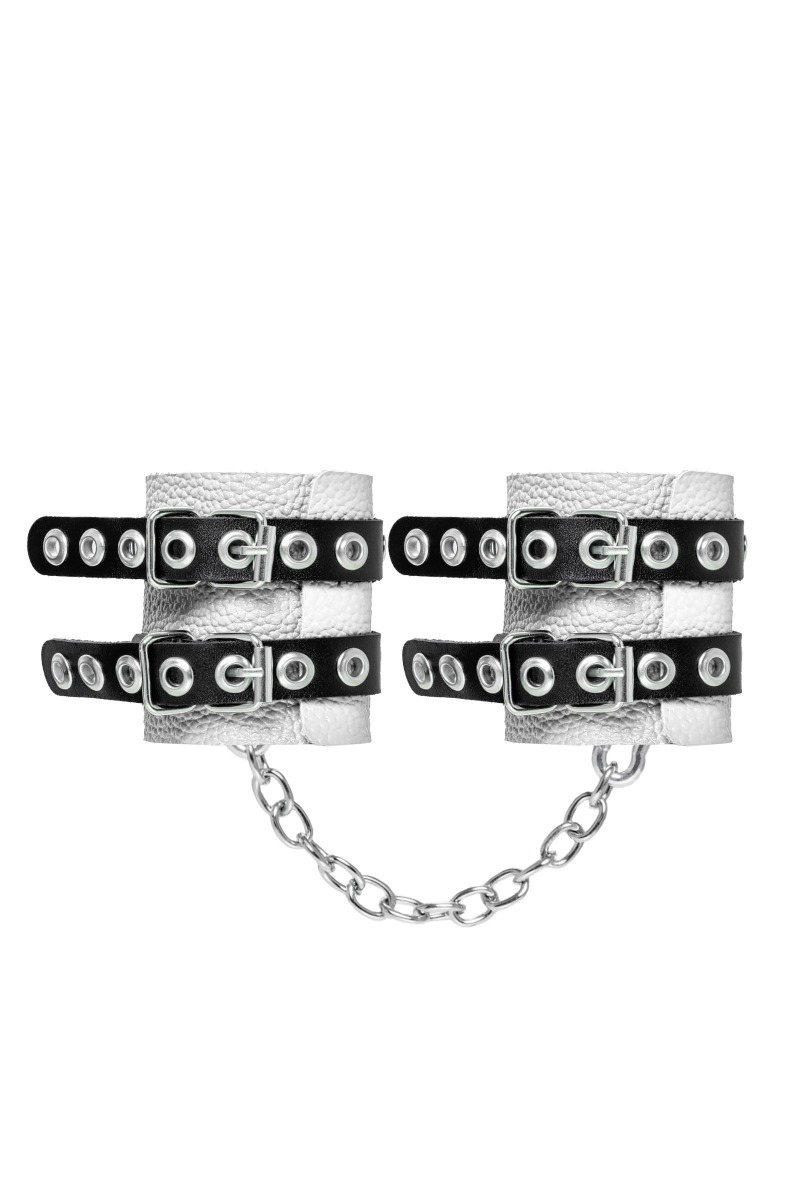 Основатели бренда уверены: лучший способ избавиться от искушения - поддаться ему! Мягкие, белые, кожаные наручники с двумя чёрными, жёсткими ремнями могут стать стильным аксессуаром, а могут послужить вашим целям по своему прямому назначению. Частичное обездвиживание и невозможность двигать руками дают вам полную власть над партнером – взрослые игры для взрослых. Наличие двух колец и карабинов, соединенных между собой металлической цепочкой, позволяет использовать изделие как раздельно – аксессуар-манжеты, так и как наручники для фиксации. К широким металлическим кольцам также можно присоединить и другие аксессуары при помощи карабинов. Благодаря универсальному размеру наручники могут использоваться и мужчинами, и женщинами. Длина манжет - 18 см, ширина - 7 см. Длина сцепки - 17 см.