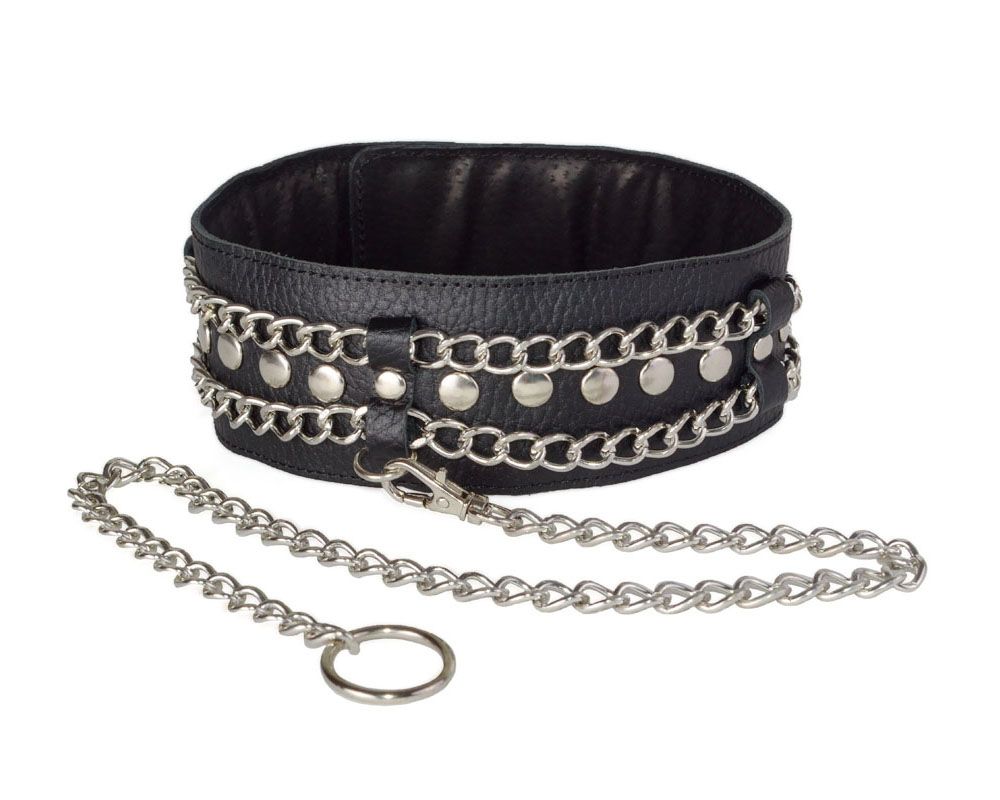 Изготовлен из натуральной кожи с велюровой подкладой. При изготовлении использована никелированная фурнитура. Размер универсальный. Ширина - 5 см. Длина цепочки (поводка) с карабином - 50 см.