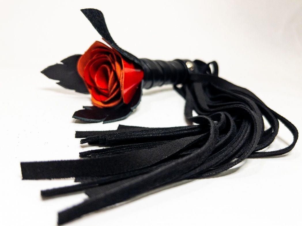 Восхитительная мини-плеть, украшенная красной розой. Цветок полностью выполнен из натуральной лаковой кожи, листочки розы и рукоятка выполнены из мягкой натуральной кожи, а хвосты плети - натуральная мягкая замша. Размеры этой плети очень изящны, поэтому данную плеть можно использовать, как генитальную, чтобы добавить новых ярких ощущений. Розочка очень удобно лежит в руке и создает неповторимую атмосферу и настроение, этот аксессуар никого не оставит равнодушным!