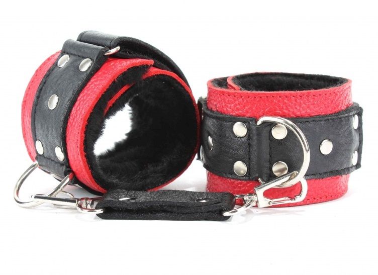 Кожаные наручники красного цвета. Украшены заклепками и соединяются между собой цепью с карабинами. Имеет вставку черного цвета на лицевой части и отделаны мехом с внутренней части. Размер наручников регулируется при помощи застежки-липучки. Ширина - 5 см. Длина цепочки - 15,5 см.