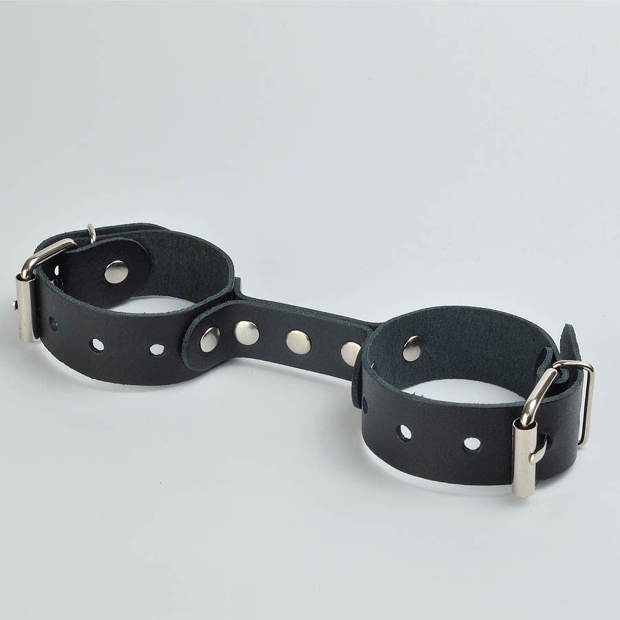 Наручники изготовлены из ременной кожи. Фурнитура никелированная. Наручники имеют кожаную перемычку, на которой зафиксированы наручники. Максимальный охват - 24 см. Ширина ремешков - 2,5 см.