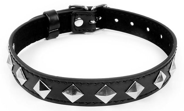 Оригинальный ошейник для любителей БДСМ-игр, декорированный металлическими украшениями. Имеет возможность регулировки размера с помощью ремешков. БДСМ-аксессуар прост в применении, не требуют специального ухода.